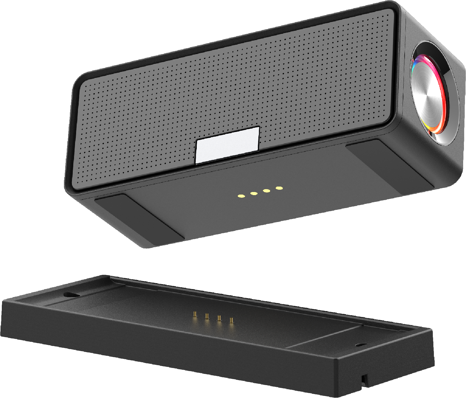 Integrated Magnets in the speaker attach to anything, including the charging base with orientation magnets and 12V/USB-C charging options